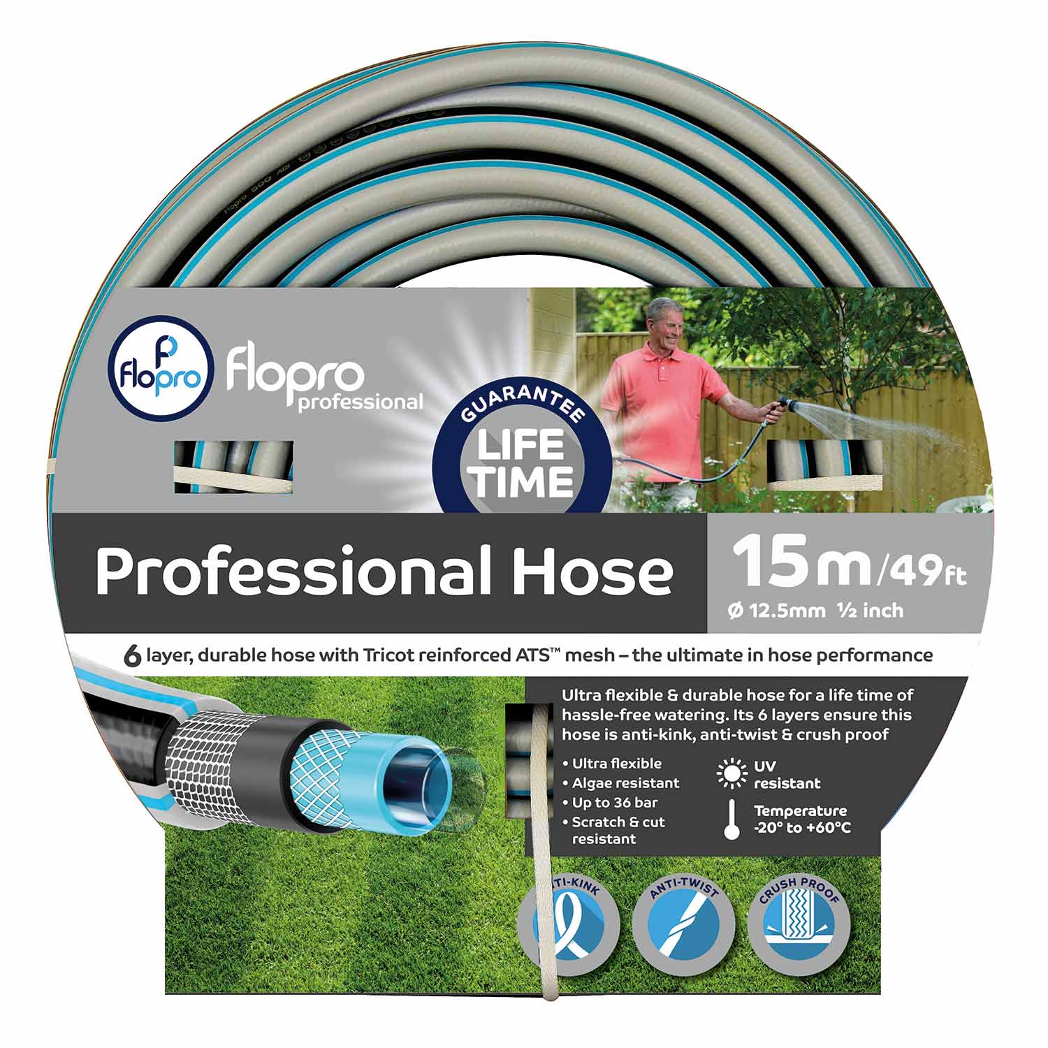 This Flopro Professional Hose is the perfect choice for any gadener looking for a hassle-free hose which lasts a lifetime! The hose is designed to be extremely tough, yet ultra-flexible and durable. Constructed from 6 layers of reinforced ATS mesh by Tricotâą. This guarantees the hose will be anti-kink, anti-twist and crush-proof. Use the Flopro Professional Hosepipe as it comes, or wind onto a wheel or cart for easier storage.