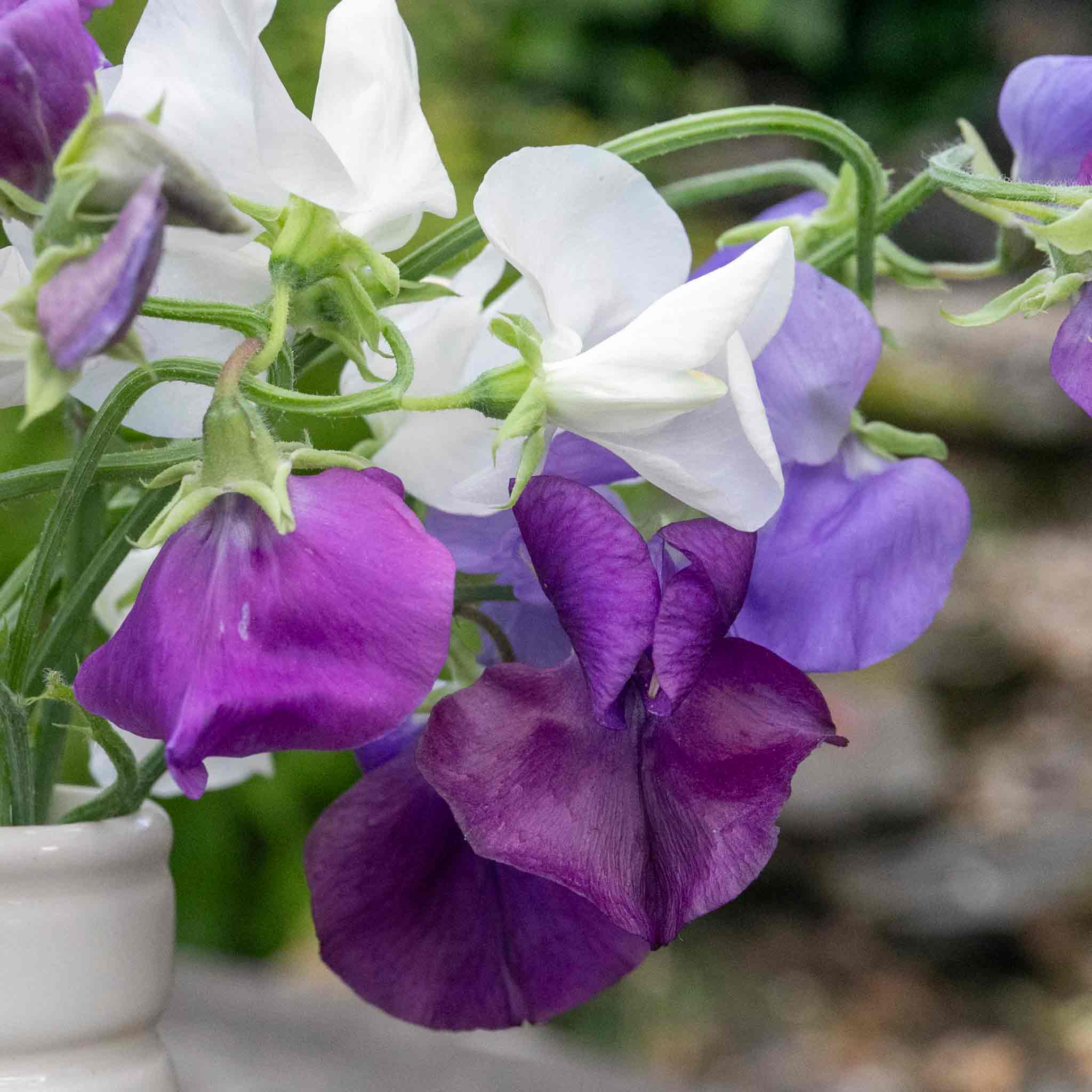 Sweet Pea ‘Rhythm and Blues Mix’ is a sophisticated blend of rich, smoky tones and soft creamy whites, creating a striking contrast in the garden and vase. With a deliciously sweet fragrance, this mix brings a sense of elegance to borders and floral arrangements alike.